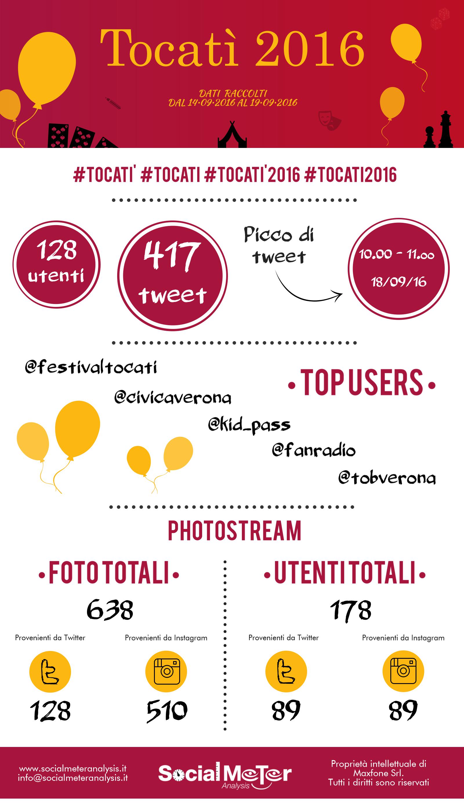 Una condivisione, quella del Festival, che si è estesa anche ai social network: : attraverso il monitoraggio di SocialMeter Analysis degli hashtag #tocatì, #tocati, #tocatì2016, #tocati2016 su Twitter, sono stati rilevati 417 tweet durante le giornate del Festival, per un totale di 116 utenti attivi. Per quanto riguarda le immagini condivise dagli utenti su Twitter e Instagram, raccolte attraverso il wall tematico Photostream monitorando gli stessi hashtag, i risultati superano le 600 foto, per un totale di 178 utenti attivi. Altri utenti particolarmente attivi sull’argomento sono stati l’account della Biblioteca Civica di Verona (@civicaverona, 56 post), quello di FAN, la radio degli studenti dell’Università di Verona (@fanradio, 14 post) e quello di del progetto To Be Verona (@tobeverona, 14 post).